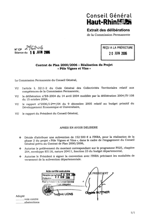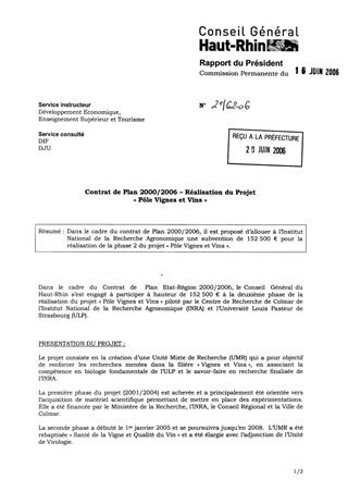 Dans le cadre du contrat de Plan 2000/2006, il est proposé d’allouer à l’Institut National de la Recherche Agronomique une subvention de 152 500 € pour la réalisation de la phase 2 du projet « Pôle Vignes et Vins ».