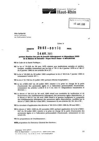 portant fixation des prix de journée hébergement et dépendance 2003 de la maison de retraite "Foyer Notre Dame" à MULHOUSE. Resumé Pièces jointes ARRETE Assemblée : Non défini Date : 14/04/2003 Rapporteur : Non défini Collectivité : Conseil départemental du Haut-Rhin Direction : Non défini Service : Direction de la Solidarité Domaine : Prix de Journée Commission :