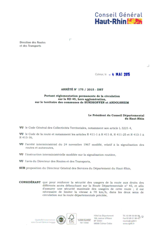 portant réglementation permanente de la circulation sur la RD 45, hors agglomération, sur le territoire des communes de SUNDHOFFEN et ANDOLSHEIM Resumé Pièces jointes ARRETE Assemblée : Non défini Date : 04/05/2015 Rapporteur : Non défini Collectivité : Conseil départemental du Haut-Rhin Direction : Non défini Service : Direction des Routes Domaine : Circulation Commission :
