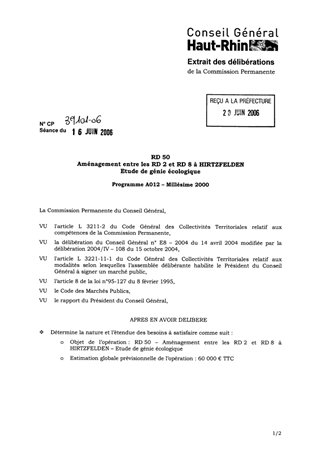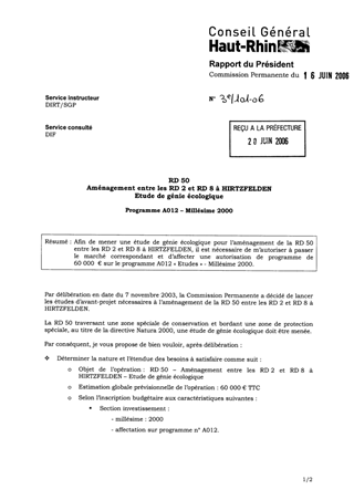 Afin de mener une étude de génie écologique pour l’aménagement de la RD 50 entre les RD 2 et RD 8 à HIRTZFELDEN, il est nécessaire de m’autoriser à passer le marché correspondant et d’affecter une autorisation de programme de 60 000 € sur le programme A012 « Etudes » - Millésime 2000.