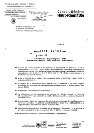 portant fixation du prix de journée 205 de la maison d'enfants "Home Saint-Jean" à MULHOUSE Resumé Pièces jointes ARRETE Assemblée : Non défini Date : 13/05/2015 Rapporteur : Non défini Collectivité : Conseil départemental du Haut-Rhin Direction : Non défini Service : Direction Etudes, Finances et Appuis de la Solidarité Domaine : Prix de Journée Commission :