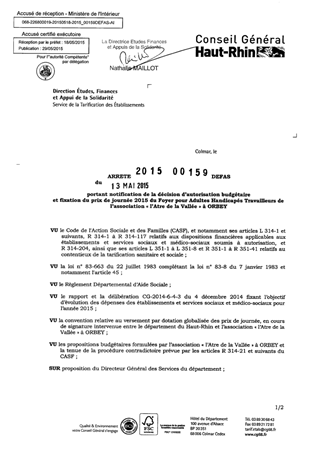 portant notification de la décision d'autorisation budgétaire et fixation du prix de journée 2015 du foyer pour adultes handicapés travailleurs de l'association "l'Atre de la Vallée" à ORBEY Resumé Pièces jointes ARRETE Assemblée : Non défini Date : 13/05/2015 Rapporteur : Non défini Collectivité : Conseil départemental du Haut-Rhin Direction : Non défini Service : Direction Etudes, Finances et Appuis de la Solidarité Domaine : Prix de Journée Commission :