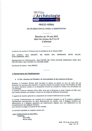 des délibérations du Conseil d'Administration du Pôle d'Archéologie Interdépartemental Rhénan (P.A.I.R.) Resumé Pièces jointes ARRETE Assemblée : Non défini Date : 19/05/2015 Rapporteur : Non défini Collectivité : Conseil départemental du Haut-Rhin Direction : Non défini Service : Direction Générale Adjointe de l'éducation et de la culture, du développement et de l'aménagement des territoires et des infrastructures Domaine : Autres (non classés) Commission :