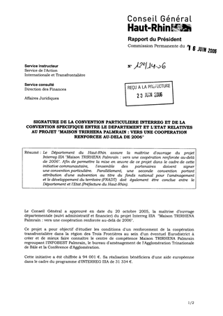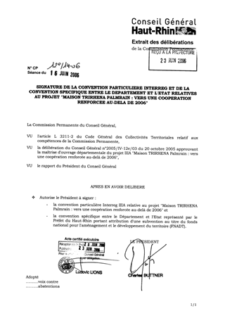 Le Département du Haut-Rhin assure la maîtrise d'ouvrage du projet Interreg IIIA "Maison TRIRHENA Palmrain : vers une coopération renforcée au-delà de 2006". Afin de permettre la mise en œuvre de ce projet dans le cadre de cette initiative communautaire, l'ensemble des partenaires doivent signer une convention particulière. Parallèlement, une seconde convention portant attribution d'une subvention au titre du fonds national pour l'aménagement et le développement du territoire (FNADT) doit également être conclue entre le Département et l'Etat (Préfecture du Haut-Rhin).