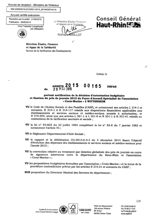 portant notification de la décision d'autorisation budgétaire et fixation du prix de journée 2015 du foyer d'accueil spécialisé de l'association "Croix-Marine" à WITTENHEIM Resumé Pièces jointes ARRETE Assemblée : Non défini Date : 20/05/2015 Rapporteur : Non défini Collectivité : Conseil départemental du Haut-Rhin Direction : Non défini Service : Direction Etudes, Finances et Appuis de la Solidarité Domaine : Prix de Journée Commission :