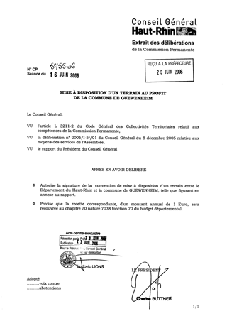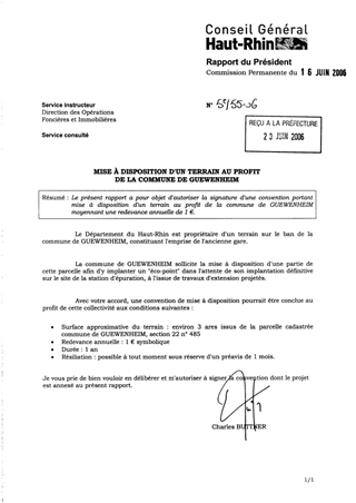 Le présent rapport a pour objet d'autoriser la signature d'une convention portant mise à disposition d'un terrain au profit de la commune de GUEWENHEIM moyennant une redevance annuelle de 1 €.