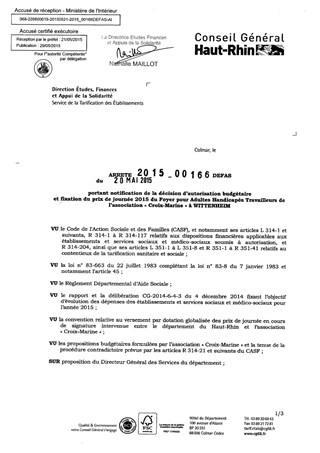 portant notification de la décision d'autorisation budgétaire et fixation du prix de journée 2015 du foyer pour adultes handicapés travailleurs de l'association "Croix Marine" à WITTENHEIM Resumé Pièces jointes ARRETE Assemblée : Non défini Date : 20/05/2015 Rapporteur : Non défini Collectivité : Conseil départemental du Haut-Rhin Direction : Non défini Service : Direction Etudes, Finances et Appuis de la Solidarité Domaine : Prix de Journée Commission :