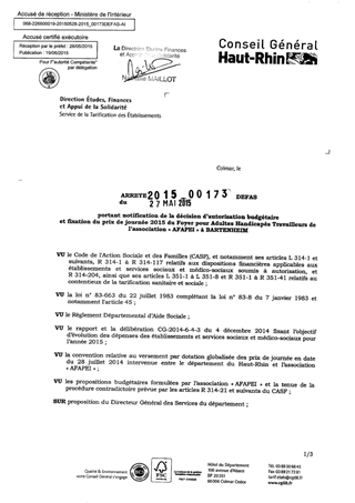 portant notification de la décision d'autorisation budgétaire et fixation du prix de journée 2015 du foyer pour adultes handicapés travailleurs de l'association "AFAPEI" à BARTENHEIM Resumé Pièces jointes ARRETE Assemblée : Non défini Date : 27/05/2015 Rapporteur : Non défini Collectivité : Conseil départemental du Haut-Rhin Direction : Non défini Service : Direction Etudes, Finances et Appuis de la Solidarité Domaine : Prix de Journée Commission :