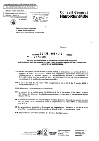 portant notification de la décision d'autorisation budgétaire et fixation du prix de journée 2015 du foyer d'accueil spécialisé de l'association "AFAPEI" à BARTENHEIM Resumé Pièces jointes ARRETE Assemblée : Non défini Date : 27/05/2015 Rapporteur : Non défini Collectivité : Conseil départemental du Haut-Rhin Direction : Non défini Service : Direction Etudes, Finances et Appuis de la Solidarité Domaine : Prix de Journée Commission :