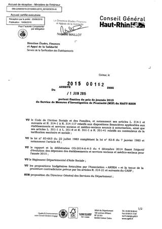 portant fixation du prix de journée 2015 du service de mesures d'investigationde proximité (MIP) du Haut-Rhin Resumé Pièces jointes ARRETE Assemblée : Non défini Date : 01/06/2015 Rapporteur : Non défini Collectivité : Conseil départemental du Haut-Rhin Direction : Non défini Service : Direction Etudes, Finances et Appuis de la Solidarité Domaine : Prix de Journée Commission :