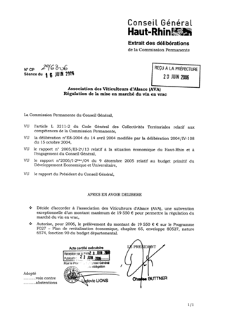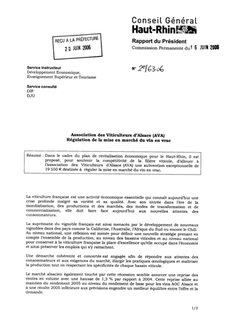Dans le cadre du plan de revitalisation économique pour le Haut-Rhin, il est proposé, pour soutenir la compétitivité de la filière viticole, d’allouer à l’association des Viticulteurs d’Alsace (AVA) une subvention exceptionnelle de 19 550 € destinée à réguler la mise en marché du vin en vrac.