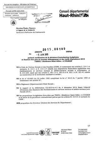 portant notification de la décision d'autorisation budgétaire et fixation des prix de journée hébergement et des tarifs dépendance 2015 de l'EHPA "Résidence Saint-Gilles" à COLMAR Resumé Pièces jointes ARRETE Assemblée : Non défini Date : 05/06/2015 Rapporteur : Non défini Collectivité : Conseil départemental du Haut-Rhin Direction : Non défini Service : Direction Etudes, Finances et Appuis de la Solidarité Domaine : Prix de Journée Commission :