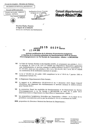 portant notification de la décision d'autorisation budgétaire et fixation de la dotation globalisée de fonctionnement 2015 du service d'accompagnement à la vie sociale de l'association "Alister" à MULHOUSE Resumé Pièces jointes ARRETE Assemblée : Non défini Date : 12/06/2015 Rapporteur : Non défini Collectivité : Conseil départemental du Haut-Rhin Direction : Non défini Service : Direction Etudes, Finances et Appuis de la Solidarité Domaine : Dotations financières Commission :