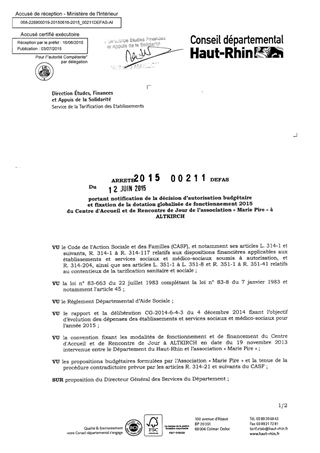 portant notification de la décision d'autorisation budgétaire et fixation de la dotation globalisée de fonctionnement 2015 du centre d'accueil et de rencontre de jour de l'association "Marie Pire" à ALTKIRCH Resumé Pièces jointes ARRETE Assemblée : Non défini Date : 12/06/2015 Rapporteur : Non défini Collectivité : Conseil départemental du Haut-Rhin Direction : Non défini Service : Direction Etudes, Finances et Appuis de la Solidarité Domaine : Dotations financières Commission :