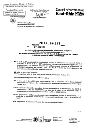 portant notification de la décision d'autorisation budgétaire et fixation de la dotation globalisée 2015 du service d'accompagnement à la vie sociale de l'association des parents d'enfants inadaptés (APEI) à HIRSINGUE Resumé Pièces jointes ARRETE Assemblée : Non défini Date : 12/06/2015 Rapporteur : Non défini Collectivité : Conseil départemental du Haut-Rhin Direction : Non défini Service : Direction Etudes, Finances et Appuis de la Solidarité Domaine : Dotations financières Commission :