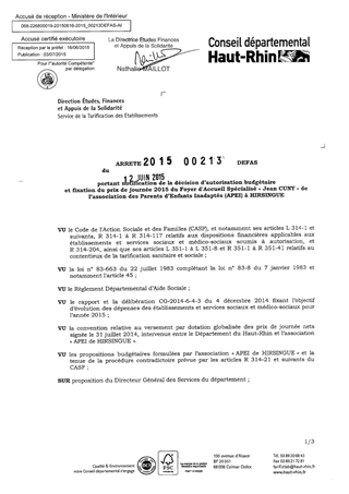 portant notification de la décision d'autorisation budgétaire et fixation du prix de journée 2015 du foyer d'accueil spécialisé "Jean Cuny" de l'association des parents d'enfants inadaptés (APEI) à HIRSINGUE Resumé Pièces jointes ARRETE Assemblée : Non défini Date : 12/06/2015 Rapporteur : Non défini Collectivité : Conseil départemental du Haut-Rhin Direction : Non défini Service : Direction Etudes, Finances et Appuis de la Solidarité Domaine : Prix de Journée Commission :