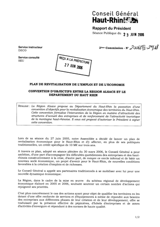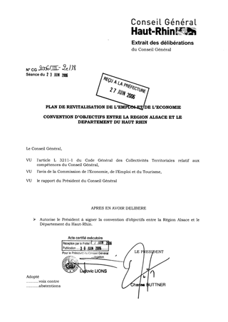 Plan de revitalisation de l'emploi et de l'économie. Convention d'objectifs entre la Région Alsace et le Département du Haut-Rhin