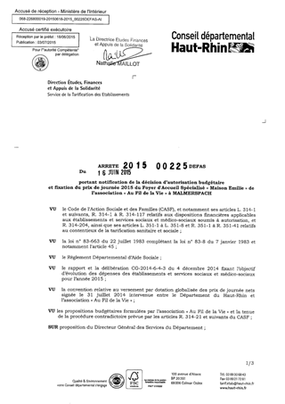 portant notification de la décision d'autorisation budgétaire et fixation du prix de journée 2015 du foyer d'accueil spécialisé "Maison Emilie" de l'association "Au Fil de la Vie" à MALMERSPACH Resumé Pièces jointes ARRETE Assemblée : Non défini Date : 16/06/2015 Rapporteur : Non défini Collectivité : Conseil départemental du Haut-Rhin Direction : Non défini Service : Direction Etudes, Finances et Appuis de la Solidarité Domaine : Prix de Journée Commission :