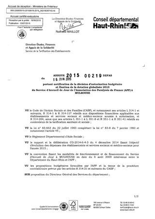 portant notification de la décision d'autorisation budgétaire et fixation de la dotation globalisée 2015 du service d'accueil de jour de l'association des Paralysés de France (ADF) à MULHOUSE Resumé Pièces jointes ARRETE Assemblée : Non défini Date : 16/06/2015 Rapporteur : Non défini Collectivité : Conseil départemental du Haut-Rhin Direction : Non défini Service : Direction Etudes, Finances et Appuis de la Solidarité Domaine : Dotations financières Commission :