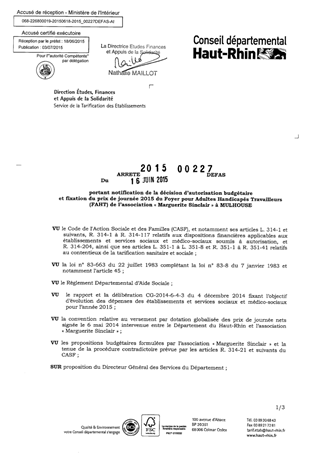 portant notification de la décision d'autorisation budgétaire et fixation du prix de journée 2015 du foyer pour adultes handicapés travailleurs (FAHT) de l'association "Marguerite Sinclair" à MULHOUSE Resumé Pièces jointes ARRETE Assemblée : Non défini Date : 16/06/2015 Rapporteur : Non défini Collectivité : Conseil départemental du Haut-Rhin Direction : Non défini Service : Direction Etudes, Finances et Appuis de la Solidarité Domaine : Prix de Journée Commission :