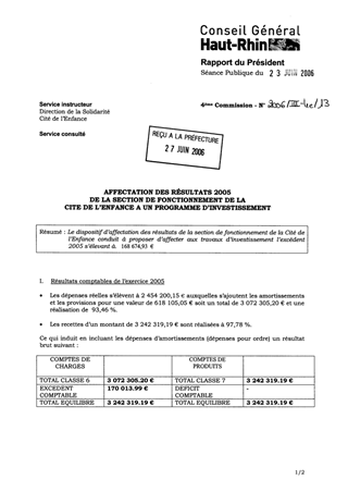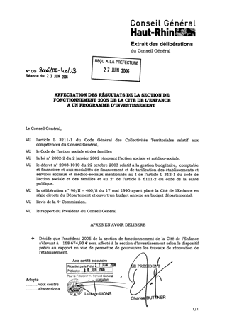 Affectation des résultats 2005 de la section de fonctionnement de la Cité de l'Enfance à un programme d'investissement