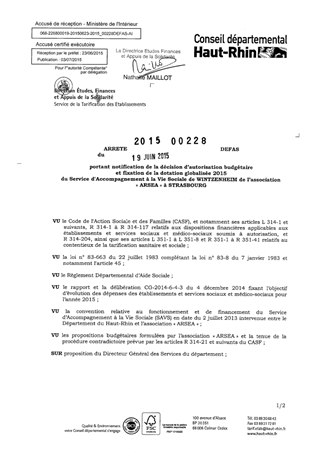 portant notification de la décision d'autorisation budgétaire et fixation de la dotation globalisée 2015 du service d'accompagnement à la vie sociale de WINTZENHEIM de l'association "ARSEA" à STRASBOURG Resumé Pièces jointes ARRETE Assemblée : Non défini Date : 19/06/2015 Rapporteur : Non défini Collectivité : Conseil départemental du Haut-Rhin Direction : Non défini Service : Direction Etudes, Finances et Appuis de la Solidarité Domaine : Dotations financières Commission :