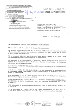 portant composition de la commission locale d'information et de surveillance (CLIS) du centre nucléaire de production d'électricité (CNPE) de FESSENHEIM Resumé Pièces jointes ARRETE Assemblée : Non défini Date : 25/06/2015 Rapporteur : Non défini Collectivité : Conseil départemental du Haut-Rhin Direction : Non défini Service : Direction de l'Environnement et du Cadre de Vie Domaine : Autres (non classés) Commission :