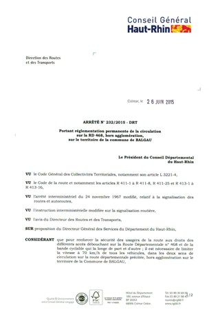 portant réglementation permanente de la circulation sur la RD 468, hors agglomération, sur le territoire de la commune de BALGAU Resumé Pièces jointes ARRETE Assemblée : Non défini Date : 26/06/2015 Rapporteur : Non défini Collectivité : Conseil départemental du Haut-Rhin Direction : Non défini Service : Direction des Routes Domaine : Circulation Commission :
