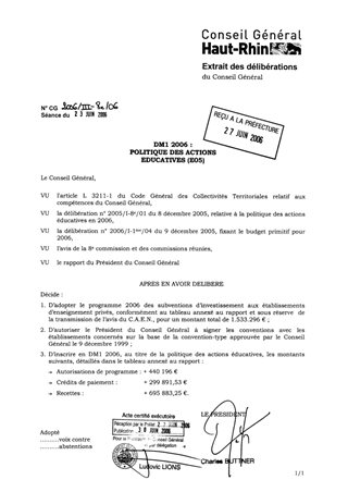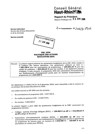 Le présent rapport présente les ajustements budgétaires de la DM1 2006, relatifs à la politique des actions éducatives. Ces ajustements s’élèvent au total, à : + 440.196 € pour les autorisations de programmes, + 299.891,53 € pour les crédits de paiement, + 695.883,25 € pour les recettes. Il est également proposé d’adopter, à cette occasion, le programme 2006 des subventions d’investissement aux établissements d’enseignement privés pour un montant d’autorisations de programmes de 1.533.296 €.