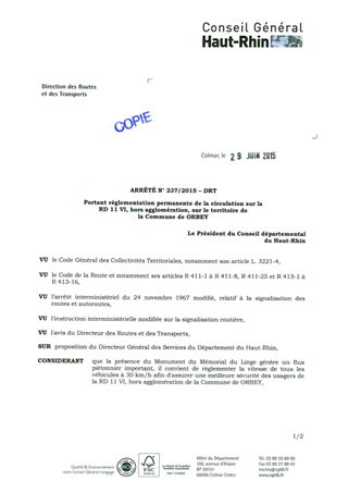 portant réglementation permanente de la circulation sur la RD 11 VI, hors agglomération, sur le territoire de la commune de ORBEY Resumé Pièces jointes ARRETE Assemblée : Non défini Date : 29/06/2015 Rapporteur : Non défini Collectivité : Conseil départemental du Haut-Rhin Direction : Non défini Service : Direction des Routes Domaine : Circulation Commission :