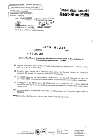 portant fixation de la dotation de fonctionnement 2015 de l'association de prévention spécialisée de COLMAR Resumé Pièces jointes ARRETE Assemblée : Non défini Date : 02/07/2015 Rapporteur : Non défini Collectivité : Conseil départemental du Haut-Rhin Direction : Non défini Service : Direction Etudes, Finances et Appuis de la Solidarité Domaine : Dotations financières Commission :