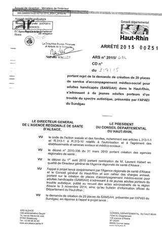 portant rejet de la demande de création de 20 places de service d'accompagnement médico-social pour adultes handicapés (SAMSAH) dans le Haut-Rhin, s'adressant à de jeunes adultes porteurs d'un trouble du spectre autistique, présentée par l'APAEI du Sundga