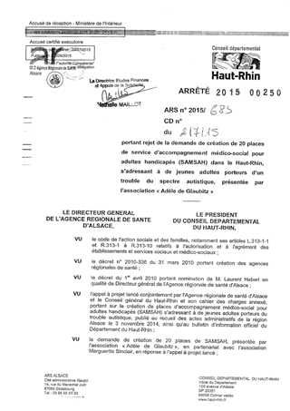 portant rejet de la demande de création de 20 places de service d'accompagnement médico-social pour adultes handicapés (SAMSAH) dans le Haut-Rhin, s'adressant à de jeunes adultes porteurs d'un trouble du spectre autistique présentée par l'association "Adè