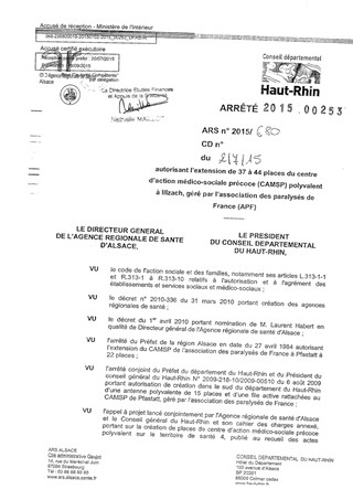 autorisant l'extension de 37 à 44 places du centre d'action médico-sociale précoce (CAMSP) polyvalent à ILLZACH, géré par l'association des paralysés de France (APF) Resumé Pièces jointes ARRETE Assemblée : Non défini Date : 02/07/2015 Rapporteur : Non défini Collectivité : Conseil départemental du Haut-Rhin Direction : Non défini Service : Direction Etudes, Finances et Appuis de la Solidarité Domaine : Autres (non classés) Commission :
