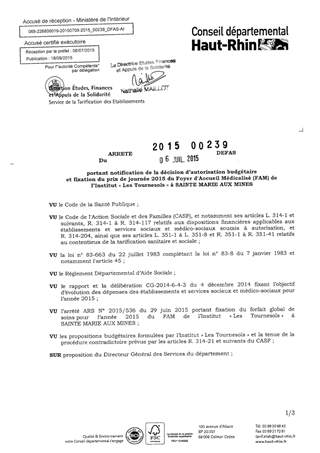 portant notification de la décision d'autorisation budgétaire et fixation du prix de journée 2015 du foyer d'accueil médicalisé (FAM) de l'Institut "Les Tournesols" à SAINTE MARIE AUX MINES Resumé Pièces jointes ARRETE Assemblée : Non défini Date : 06/07/2015 Rapporteur : Non défini Collectivité : Conseil départemental du Haut-Rhin Direction : Non défini Service : Direction Etudes, Finances et Appuis de la Solidarité Domaine : Prix de Journée Commission :