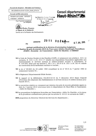 portant notification de la décision d'autorisation budgétaire et fixation du prix de journée 2015 du foyer pour adultes handicapés travailleurs (FAHT) "Kennedy" de l'association "Adèle de Glaubitz" à CERNAY Resumé Pièces jointes ARRETE Assemblée : Non défini Date : 07/07/2015 Rapporteur : Non défini Collectivité : Conseil départemental du Haut-Rhin Direction : Non défini Service : Direction Etudes, Finances et Appuis de la Solidarité Domaine : Prix de Journée Commission :