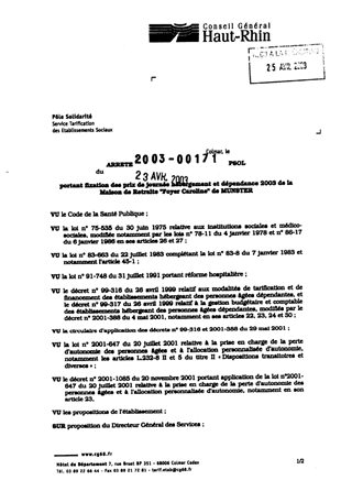 portant fixation des prix de journée hébergement et dépendance 2003 de la maison de retraite "Foyer Caroline" de MUNSTER. Resumé Pièces jointes ARRETE Assemblée : Non défini Date : 23/04/2003 Rapporteur : Non défini Collectivité : Conseil départemental du Haut-Rhin Direction : Non défini Service : Direction de la Solidarité Domaine : Prix de Journée Commission :