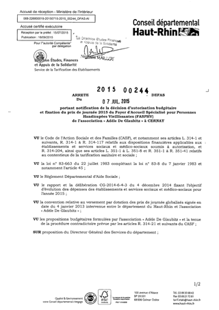portant notification de la décision d'autorisation budgétaire et fixation du prix de journée 2015 du foyer d'accueil spécialisé pour personnes handicapés vieillissantes (FASPHV). Resumé Pièces jointes ARRETE Assemblée : Non défini Date : 07/07/2015 Rapporteur : Non défini Collectivité : Conseil départemental du Haut-Rhin Direction : Non défini Service : Direction Etudes, Finances et Appuis de la Solidarité Domaine : Prix de Journée Commission :