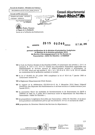 portant notification de la décision d'autorisation budgétaire et fixation de la dotation globalisée 2015 du service d'accompagnement à la vie sociale de l'association "Adèle de Glaubitz" à CERNAY Resumé Pièces jointes ARRETE Assemblée : Non défini Date : 07/07/2015 Rapporteur : Non défini Collectivité : Conseil départemental du Haut-Rhin Direction : Non défini Service : Direction Etudes, Finances et Appuis de la Solidarité Domaine : Dotations financières Commission :