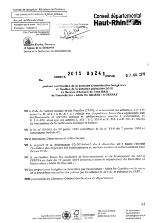 portant notification de la décision d'autorisation budgétaire et fixation de la dotation globalisée 2015 du service d'accueil de jour (SAJ) de l'association "Adèle De Glaubitz" à CERNAY Resumé Pièces jointes ARRETE Assemblée : Non défini Date : 07/07/2015 Rapporteur : Non défini Collectivité : Conseil départemental du Haut-Rhin Direction : Non défini Service : Direction Etudes, Finances et Appuis de la Solidarité Domaine : Dotations financières Commission :