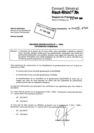 A l’occasion de la séance du 30 mars 2006, notre assemblée a décidé la création d’une nouvelle rubrique d’aide pour les gendarmeries construites sous forme de partenariat public-privé. Les premiers dossiers nous ayant été transmis, il y a lieu de prévoir l’inscription d’un crédit budgétaire de 223 000 € en AP et 100 000 € en CP afin de pouvoir programmer ces dossiers.