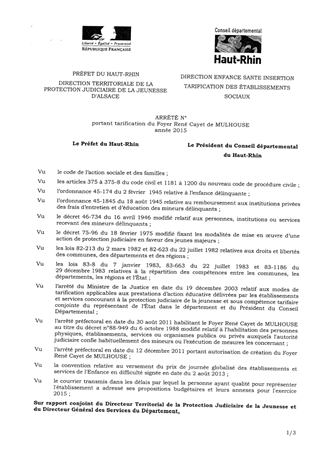portant tarification du foyer René Cayet de Mulhouse année 2015 Resumé Pièces jointes ARRETE Assemblée : Non défini Date : 17/07/2015 Rapporteur : Non défini Collectivité : Conseil départemental du Haut-Rhin Direction : Non défini Service : Direction Enfance Santé Insertion Domaine : Autres (non classés) Commission :