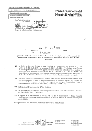 portant notification de la décision d'autorisation budgétaire pour l'exercice 2015 concernant l'association Aide et Intervention à Domicile du Haut-Rhin/ Nord à COLMAR Resumé Pièces jointes ARRETE Assemblée : Non défini Date : 27/07/2015 Rapporteur : Non défini Collectivité : Conseil départemental du Haut-Rhin Direction : Non défini Service : Direction Etudes, Finances et Appuis de la Solidarité Domaine : Dotations financières Commission :