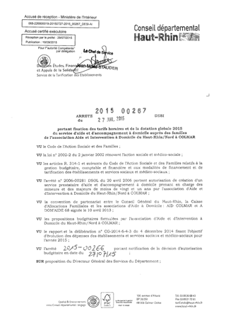 portant fixation des tarifs horaires et de la dotation globale 2015 du service d'aide et d'accompagnement à domicile auprès des familles de l'association d'aide et intervention à domicile du Haut-Rhin / Nord à COLMAR Resumé Pièces jointes ARRETE Assemblée : Non défini Date : 27/07/2015 Rapporteur : Non défini Collectivité : Conseil départemental du Haut-Rhin Direction : Non défini Service : Direction Etudes, Finances et Appuis de la Solidarité Domaine : Dotations financières Commission :