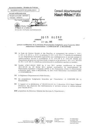 portant notification de la décision d'autorisation budgétaire pour l'exercice 2015 concernant l'Association "A DOM'AIDE 68" à MULHOUSE Resumé Pièces jointes ARRETE Assemblée : Non défini Date : 27/07/2015 Rapporteur : Non défini Collectivité : Conseil départemental du Haut-Rhin Direction : Non défini Service : Direction Etudes, Finances et Appuis de la Solidarité Domaine : Dotations financières Commission :