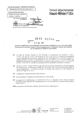 portant notification de la décision d'autorisation budgétaire pour l'exercice 2015 concernant le service d'aide et d'accompagnement à domicile auprès des familles de la Fédération ADMR du Haut-Rhin Resumé Pièces jointes ARRETE Assemblée : Non défini Date : 27/07/2015 Rapporteur : Non défini Collectivité : Conseil départemental du Haut-Rhin Direction : Non défini Service : Direction Etudes, Finances et Appuis de la Solidarité Domaine : Dotations financières Commission :