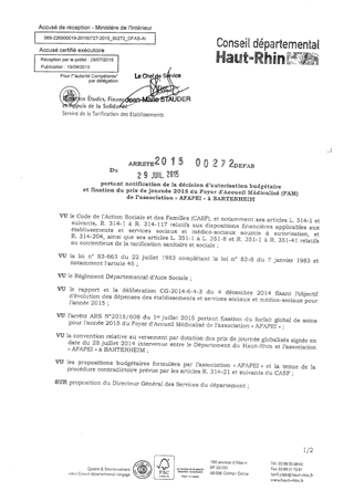 portant notification de la décision d'autorisation budgétaire et fixation du prix de journée 2015 du foyer d'accueil médicalisé (FAM) de l'association "AFAPEI" à BARTENHEIM Resumé Pièces jointes ARRETE Assemblée : Non défini Date : 29/07/2015 Rapporteur : Non défini Collectivité : Conseil départemental du Haut-Rhin Direction : Non défini Service : Direction Etudes, Finances et Appuis de la Solidarité Domaine : Prix de Journée Commission :