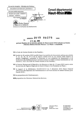 portant fixation de la dotation globale de financement 2015 allouée au Centre d'Action Médico-Sociale Précoce "Le Phare" à ILLZACH Resumé Pièces jointes ARRETE Assemblée : Non défini Date : 29/07/2015 Rapporteur : Non défini Collectivité : Conseil départemental du Haut-Rhin Direction : Non défini Service : Direction Etudes, Finances et Appuis de la Solidarité Domaine : Dotations financières Commission :