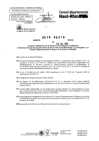 portant notification de la décision d'autorisation budgétaire et fixation du prix de journée 2015 du foyer d'accueil médicalisé "Les Peupliers" au centre départemental de repos et de soins à COLMAR Resumé Pièces jointes ARRETE Assemblée : Non défini Date : 30/07/2015 Rapporteur : Non défini Collectivité : Conseil départemental du Haut-Rhin Direction : Non défini Service : Direction Etudes, Finances et Appuis de la Solidarité Domaine : Prix de Journée Commission :