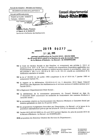 portant modification de l'arrêté 2015-00142-DESI du 22.04.2015 relatif à la fixation du prix de journée 2015 de la Maison d'Enfants "Le Bercail" de GUEBWILLER Resumé Pièces jointes ARRETE Assemblée : Non défini Date : 31/07/2015 Rapporteur : Non défini Collectivité : Conseil départemental du Haut-Rhin Direction : Non défini Service : Direction Etudes, Finances et Appuis de la Solidarité Domaine : Prix de Journée Commission :